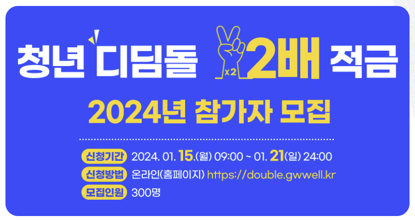 강원도에서 운영하는 2024년 청년 디딤돌 2배 적금은 2024년 1월 15일 월요일 오전 9시부터 1월 21일 일요일 자정까지 7일간 신청할 수 있습니다. 신청은 온라인 홈페이지에서 할 수 있으며 모집인원은 300명입니다. 선착순 지원은 아니지만 필요 서류 등을 준비하고 올바르게 신청하기 위해서는 미리 신청하는 것이 좋을 듯합니다.