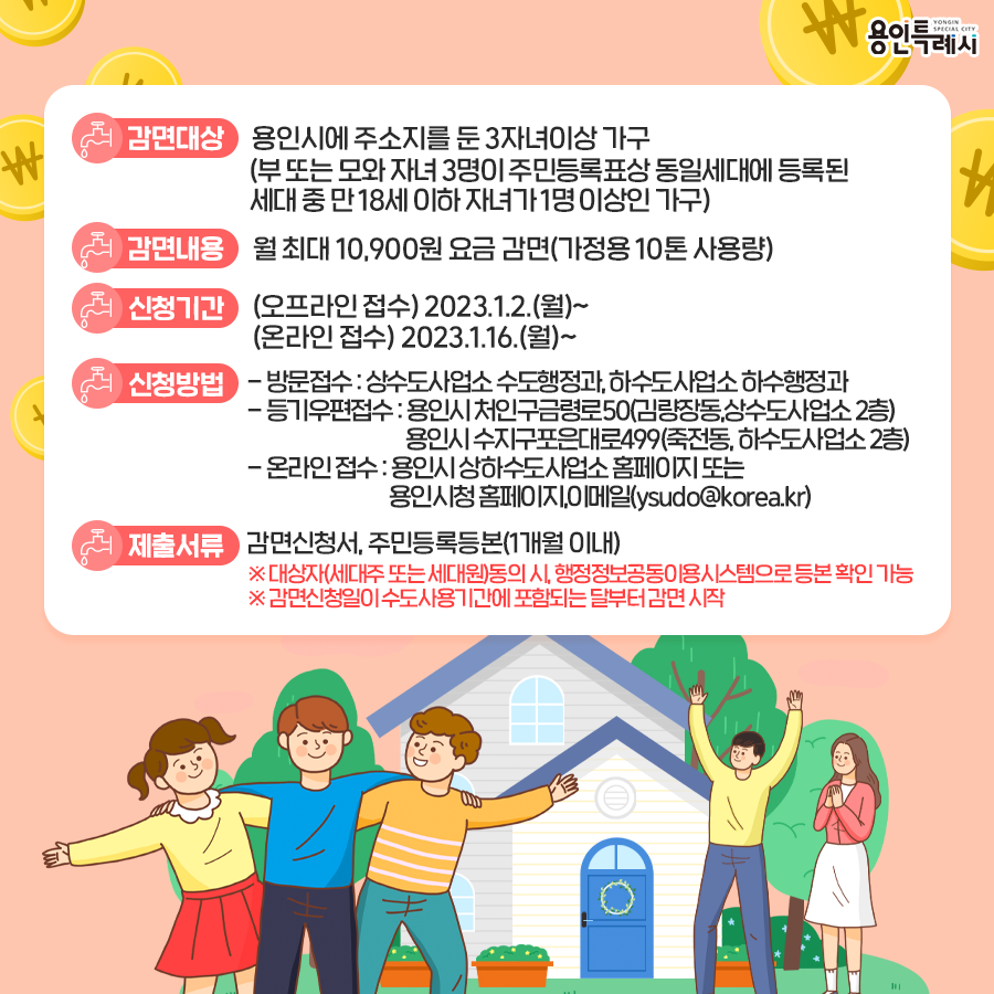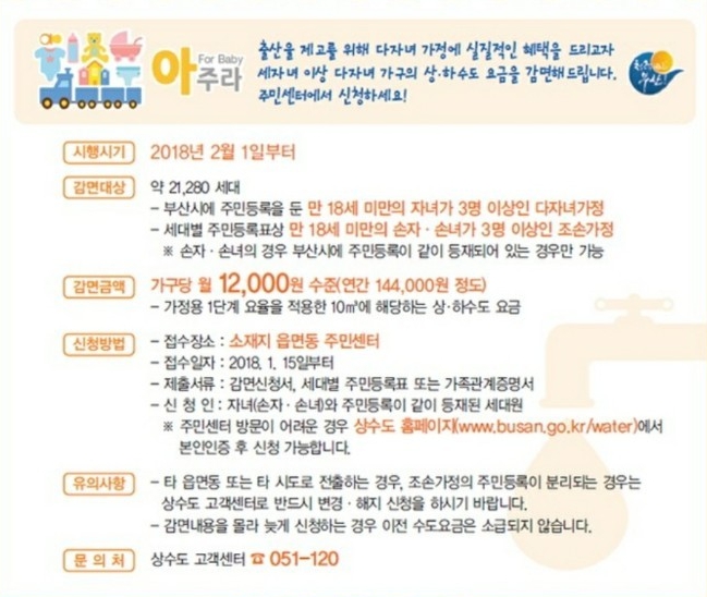 다자녀 수도요금 감면 혜택은 전기요금 감면 혜택과 다르게 지자체별로 정보가 다르다는 점 미리 숙지하고 계셔야 합니다. 그래서 다자녀 가정의 기준도 다르고, 감면 내용도 다르고, 신청 방법도 다른 대요. 다자녀의 기준이 3명인 지역, 2명부터 다자녀로 보는 지역, 손자, 손녀가 3명인 조손가정도 다자녀 혜택을 볼 수 있는 지역, 안타깝게도 다자녀 수도요금 감면 혜택이 아예 제공되지 않는 지자체도 있답니다. 어찌 됐든 점점 혜택을 적용하는 지역이 확대되어 가고 있는 추세라고 하니 하루 빨리 모든 지역에서 다자녀 가정 상수도요금 할인이 적용되길 바라봅니다.