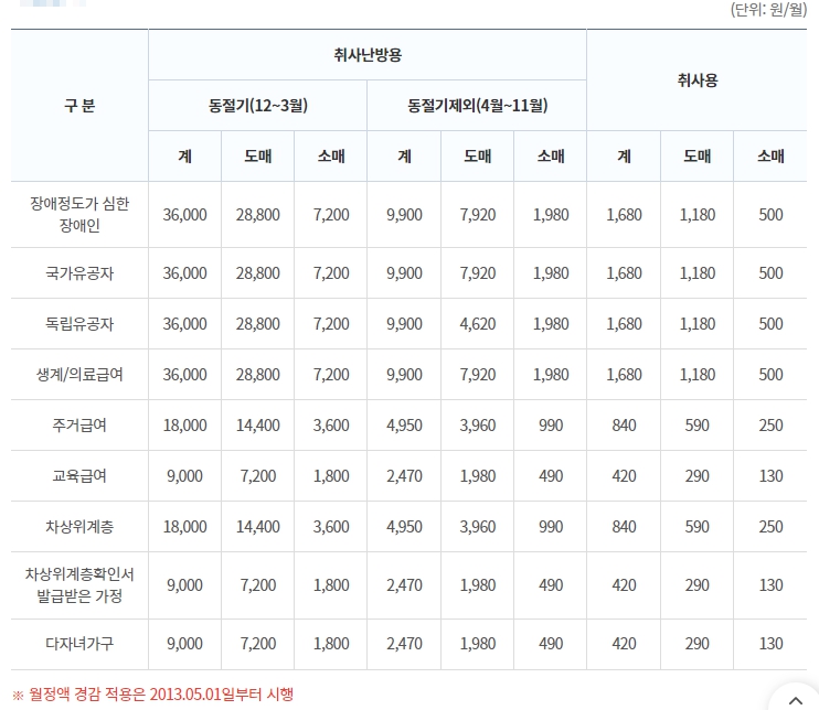 도시가스 요금 감면은 감면 대상자가 주택용으로 사용하는 도시가스만 감면되며 지원 대상에 따라 지원금액이 달라집니다. 또한 최근 난방비 급등으로 인한 어려움이 많아 2023년도에는 도시가스 경감 폭이 확대되며 경감금액 월 한도 50% 상행되어 운영됩니다. 위 표는 인상된 할인 금액이 표기된 것이니 참고하시면 좋을 것 같습니다.