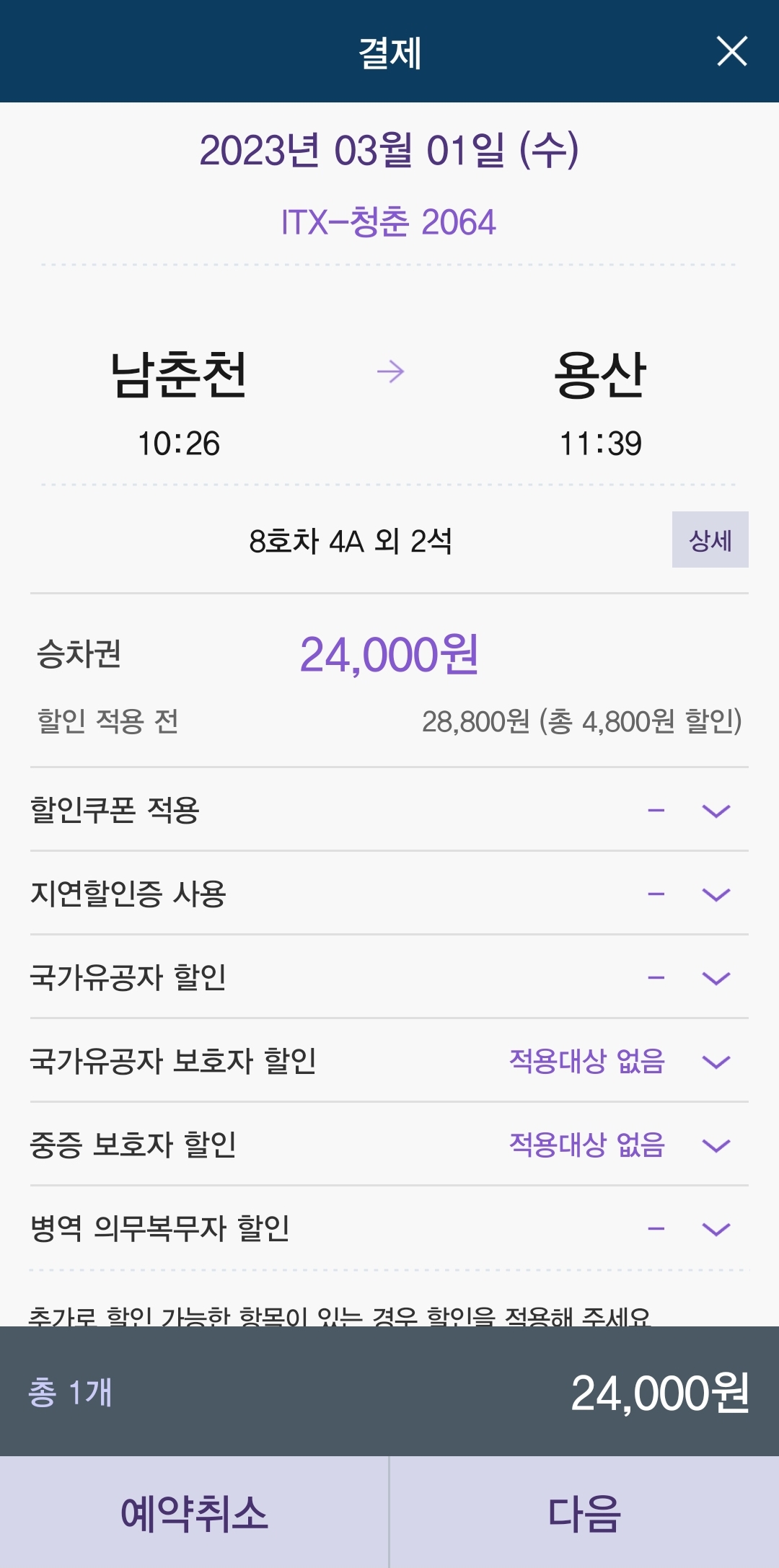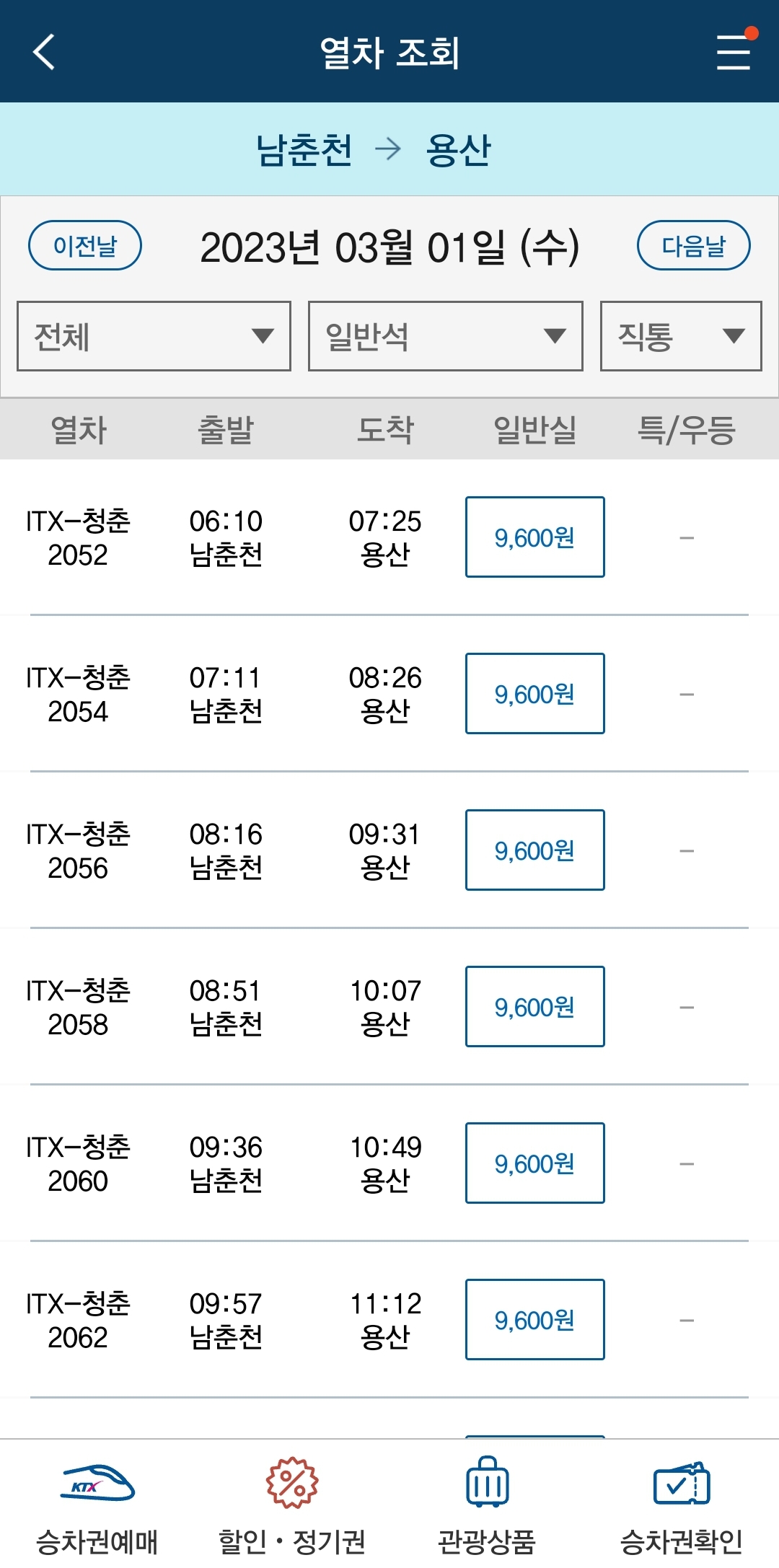 문화누리카드로 ktx 예매하는 방법 아주 간단합니다. 오프라인, 온라인 모두 사용 가능하며 온라인의 경우 코레일 PC 사이트, 코레일 어플 모두 사용 가능한데 코레일 앱에서 사용하는 게 가장 편한 것 같아 모바일(앱) 기준으로 안내해 드리겠습니다. ①. 코레일 앱을 실행해서 예매하고자 하는 승차권을 선택(역, 시간, 좌석) 합니다. 일반적으로 표 예매하는 것과 똑같이 하시면 됩니다.