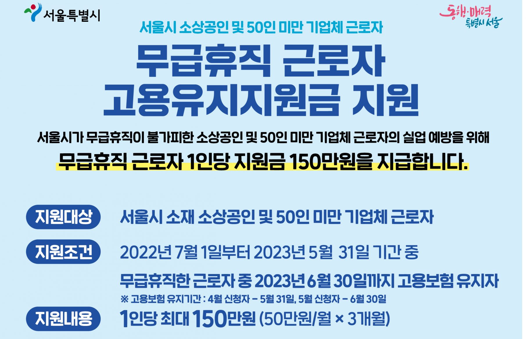 서울시 무급휴직 지원금 대상자가 되면 근로자 1인당 최대 150만 원(50만원/월X3개월)을 지원받을 수 있습니다.
