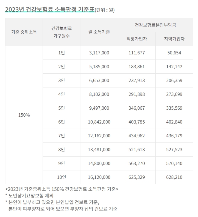 * 본인이 납부하고 있으면 본인납입 건보료 기준, 본인이 피부양자로 되어 있으면 부양자 납입 건보료 기준
