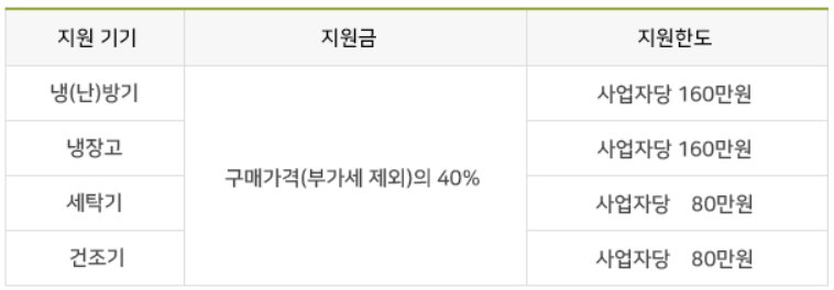 고효율기기 구매 비용을 지원받기 위해서는 지원 가능한 품목을 구매해야 합니다. 기본적으로 기기에 부착 된 에너지효율등급 라벨이 1등급인 제품만 지원 가능하며, 지원가능기기는 에너지효율 1등급 냉(난)방기, 세탁기, 건조기, 냉장고 신품 (냉장고는 상업용, 일반용 모두 가능)이 해당됩니다.