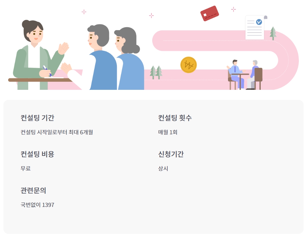 신용부채관리 컨설팅이란 정책서민금융을 이용 중이거나 지원대상 요건에 부합하는 분을 대상으로, 금융 전문 컨설턴트가 월 1회 신용과 부채 상태를 점검해 금융비용 경감 솔루션을 제공하는 1:1 맞춤형 무료 컨설팅입니다. 여기서 중요한 점은 금융 전문 컨설턴트가 무료로 컨설팅을 해 준다는 점입니다. 일반적으로 신용부채와 같은 재무 컨설팅을 받아보려면 비용이 만만치 않은데 믿을 수 있는 국가기관을 통해 무료로 받을 수 있다는 것이 상당한 장점인 것 같습니다.