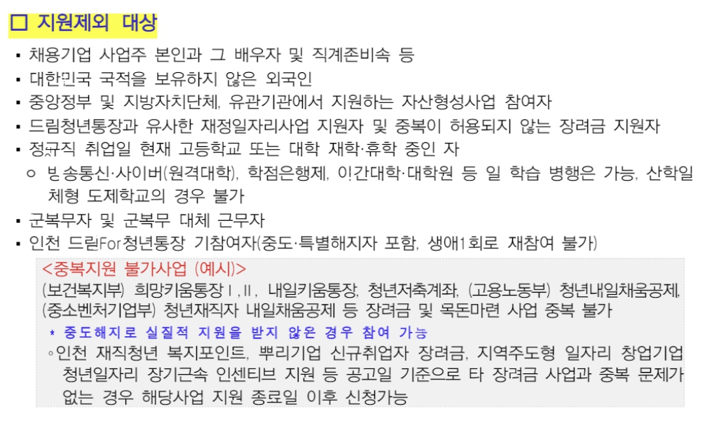 앞서 설명드린 지원조건을 모두 충족하더라도 지원되지 않는 경우도 있는데요. 대표적으로 드림청년통장과 유사한 재정일자리사업 지원자 또는 중복이 허용되지 않는 장려금 지원자는 신청할 수 없습니다. 예를 들어 희망키움통장이나 내일키움통장, 청년저축계좌, 내일채움공제 등은 동일한 자산형성형 지원 사업으로 해당 제도의 지원을 받은 적이 있다면 안타깝게도 드림통장은 신청할 수 없습니다.