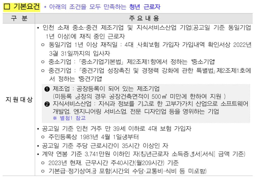 | 지원대상 | 인천 소재 중소, 중견 제조기업, 지식서비스산업 기업(공고일 기준 동일기업 1년 이상)에 근무 중인 만 39세 이하 인천 거주 청년 근로자 |
