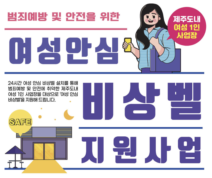 여성안심벨 지원사업은 제주도내 여성 1인 사업장의 안전과 범죄예방을 위해 서귀포 YMCA에서 보안장치를 지원하는 사업입니다. 해당 지원 사업에 참여하여 대상자가 되면 실내 보안 서비스 장치 설치(12개월 지원)를 받을 수 있습니다.
