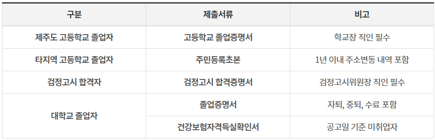 | ① 도내 고등학교를 졸업한 자 ② 공고일 6개월 이전(24.1.1.)부터 제주도에 주민등록이 되어있는 자 ※ ①, ② 중 하나에 해당하면 지원 가능 |