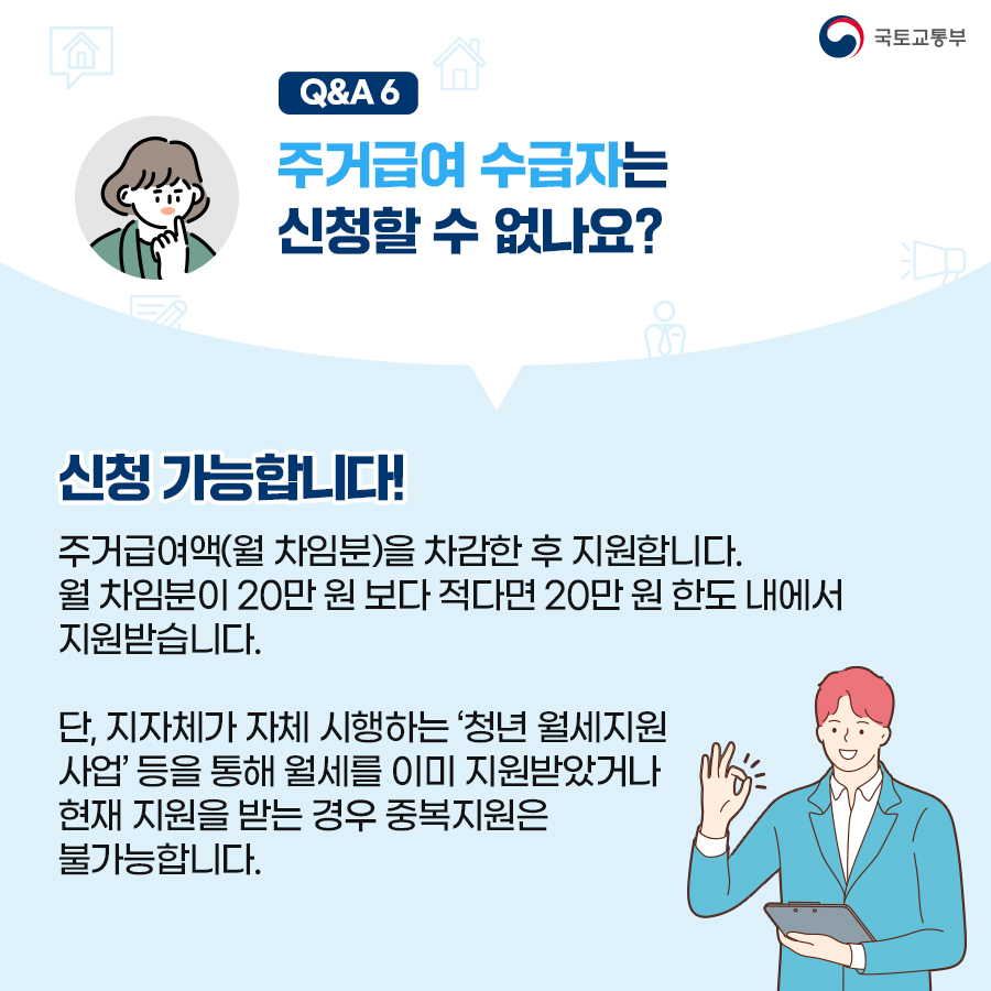 한시 특별지원 제도이기도 하고, 청년들에게 많은 도움이 되는 제도이다 보니 궁금한 점이 한두 가지가 아니죠. 그래서 국토교통부에서 배부한 Q&A를 첨부해 보았습니다. 많은 분들이 공통적으로 문의하는 내용을 정리한 것이니 청년 월세 지원 제도에 관심 있는 분들께는 많은 도움이 될 것입니다.