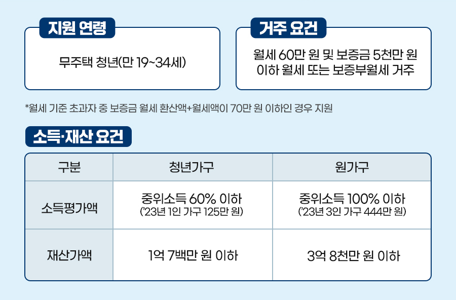 나이는 만 19세에서 34세까지 부모님과 별도 거주해야 하며, 당연한 이야기겠지만 월세 지원을 받기 위해선 월세로 거주를 하고 있어야겠죠? 거주요건은 월세 60만 원 및 보증금 5천만 원 이하 월세 또는 보증부 월세 거주자이면서 무주택자여야 합니다.