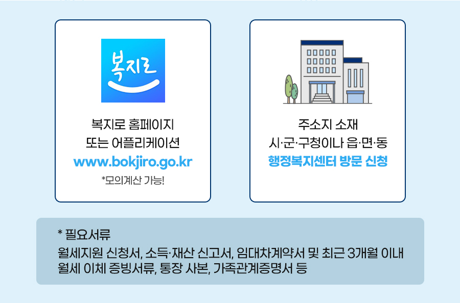 청년 월세 지원 신청은 복지로 홈페이지, 애플리케이션 또는 주소지 소재 시/군/구청이나 읍/면/동 행정복지센터에 방문하여 할 수 있습니다. 내가 월세 지원을 받을 수 있는지 없는지 예측해 보기 위해선 모의계산을 이용하면 되는데요. 복지로 사이트에서 모의계산이 가능하니 적극 활용해 보시면 좋을 것 같습니다.