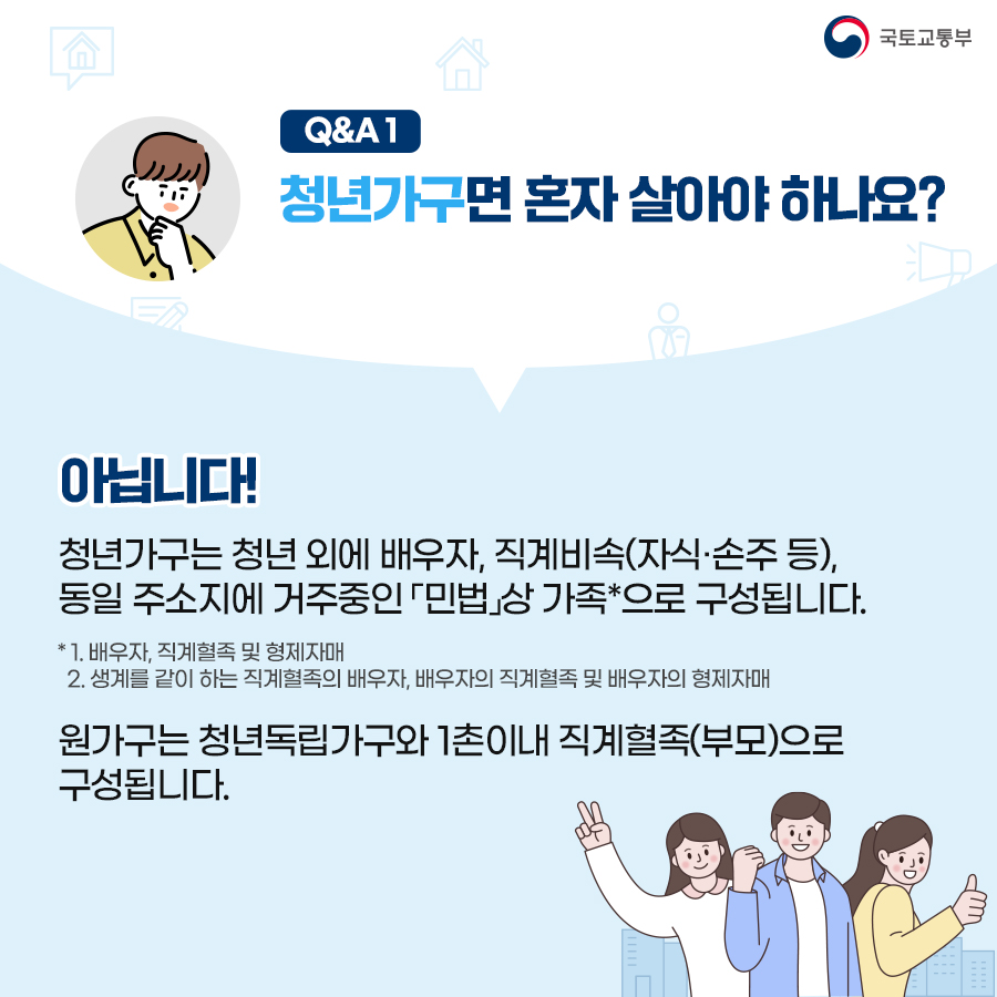 청년가구는 청년 외에 배우자, 직계비속, 동일 주소지에 거주중인 민법상 가족으로 구성.