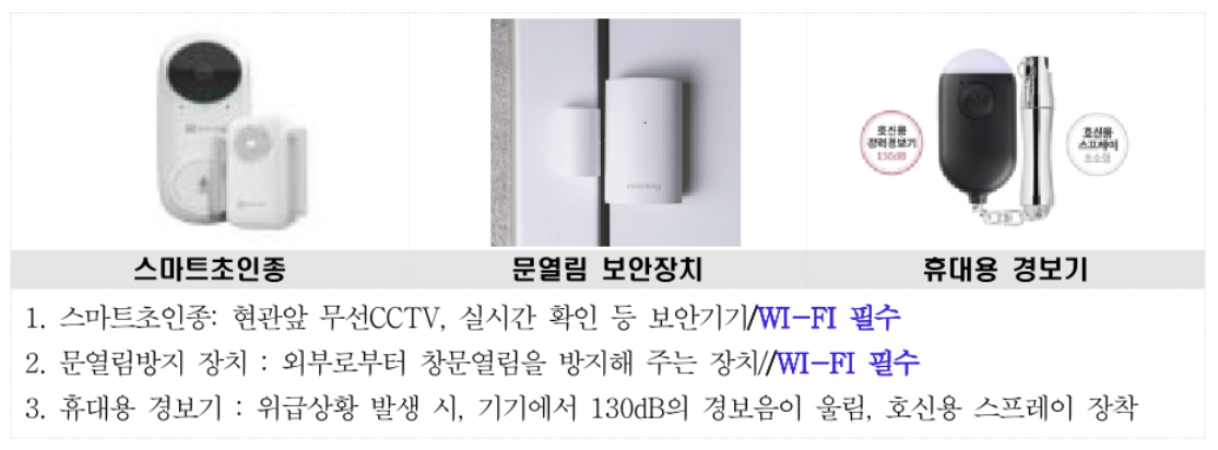 해당 지원 사업의 대상이 되면 스마트초인종, 문 열림 보안장치, 휴대용 경보기 3종 세트를 지원받을 수 있습니다. 지원 품목을 보기만 해도 든든해지는 기분이죠?
