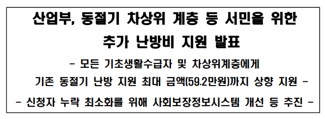 지난 2월 1일 산업통상자원부는 동절기 난방비로 인한 어려움을 겪고 있는 차상위 계층 등 서민을 위한 추가 난방비 지원 내용을 발표하였습니다. 핵심적인 내용만 살펴보면 모든 기초생활수급자 및 차상위계층에게 기존 동절기 난방 지원을 하고, 최대 지원금액은 59만 2천 원까지 될 것이라고 하였습니다. 또한 난방비 지원은 신청한 대상자에게만 지급되는 만큼 신청자 누락 최소화를 위해 사회보장정보시스템 개선 등을 추진한다고 발표하였습니다.