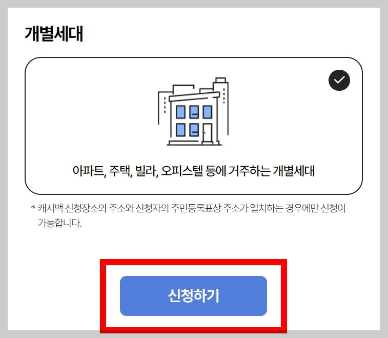 에너지캐시백 신청할 고객번호를 확인하기 위해 "주민등록 주소 확인" 버튼을 눌러 신청인의 주소를 입력합니다.