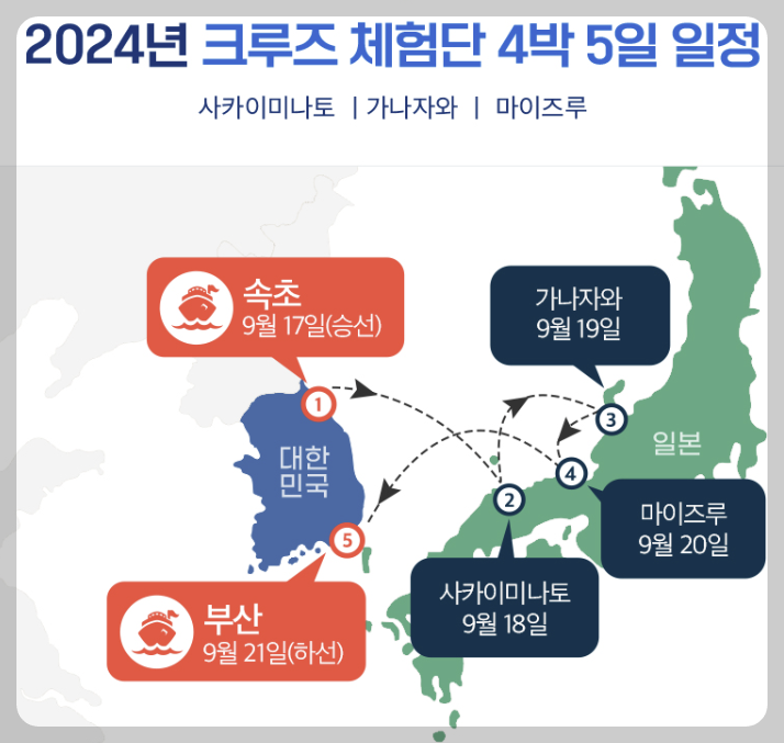 2024년 크루즈 체험단은 코스타 세레나호를 타고 속초를 출발하여 사카이미나토, 가나자와, 마이즈루를 거쳐 부산으로 입항하는 일정으로 진행됩니다. 해당 체험단에는 총 55개팀이 모집되며, 2024년 9월 17일부터 9월 21일 4박 5일 동안의 여행을 즐기게 됩니다.