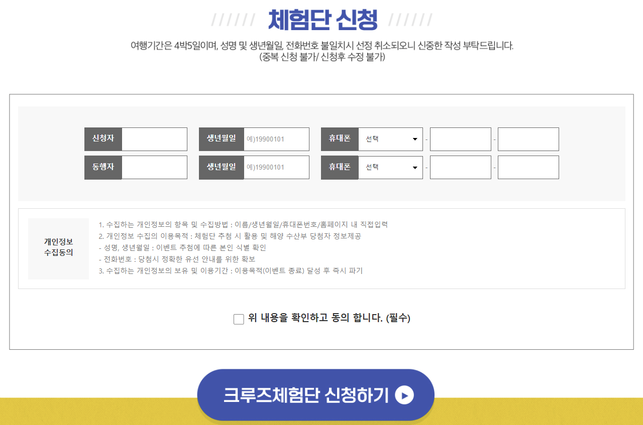 - 2016년, 2017년, 2018년, 2019년, 2023년 해양수산부 크루즈 체험단으로 선정 된 신청인과 동행인은 신청이 불가능합니다.