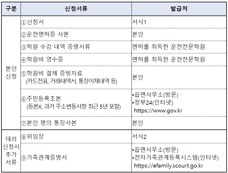 운전면허 학원비 지원 신청을 위해서는 주소지 관할 읍, 면, 행정복지센터로 방문하거나 등기우편으로 신청하시면 됩니다.