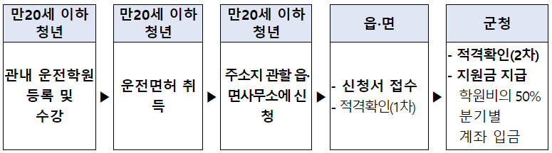 | 관내 운전전문학원 등록 후 운전면허 취득 시 학원비의 50% 지원 |