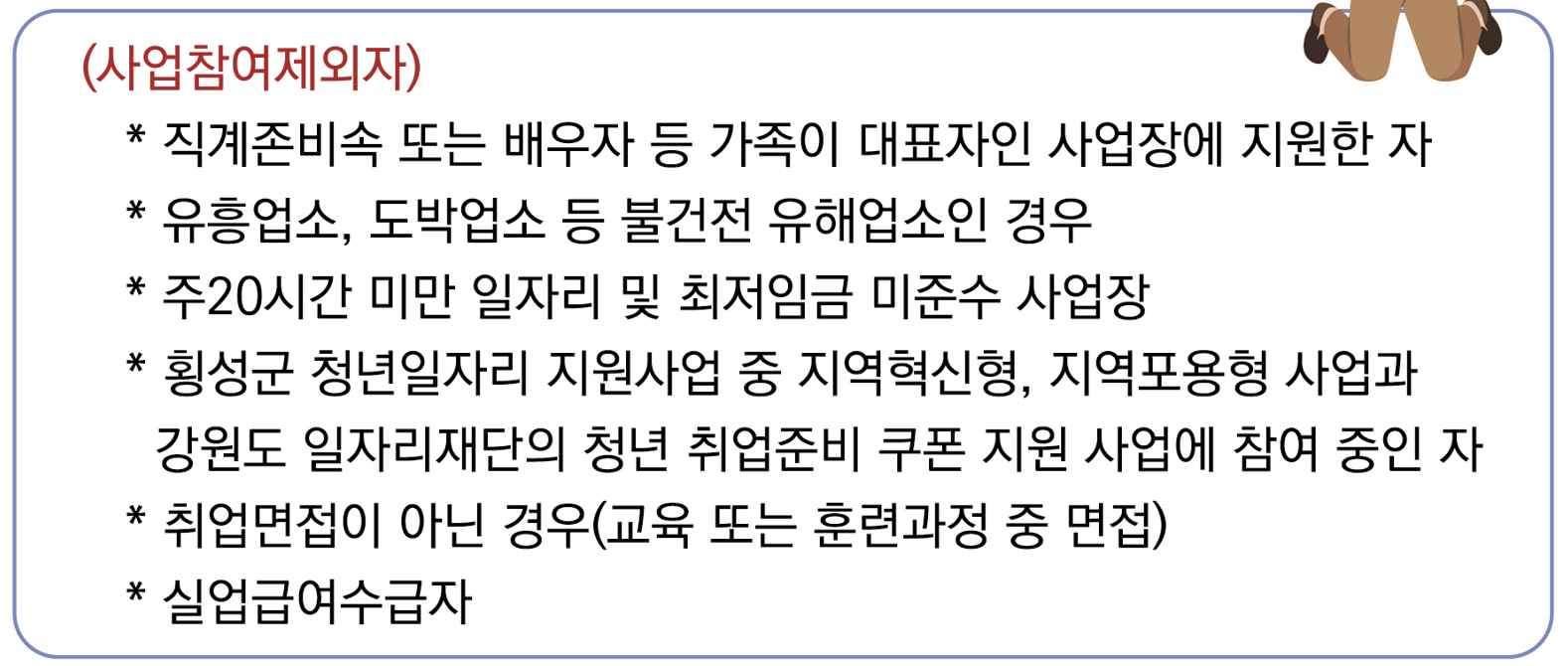 다만 조건에 충족하더라도 참여할 수 없는 경우도 있습니다. 직계존비속 또는 배우자 등 가족이 대표자인 사업장에 지원한 경우, 유흥업소, 도박업소 등 불건전 유해업소인 경우, 주 20시간 미만 일자리 및 최저임금 미준수 사업장인 경우, 횡성군 청년일자리 지원사업 중 지역혁신형, 지역포용형 사업과 강원도 일자리재단의 청년 취업준비 쿠폰 지원 사업에 참여 중인 자, 취업면접이 아닌 경우, 실업급여수급자는 아쉽게도 면접 수당을 신청할 수 없습니다.