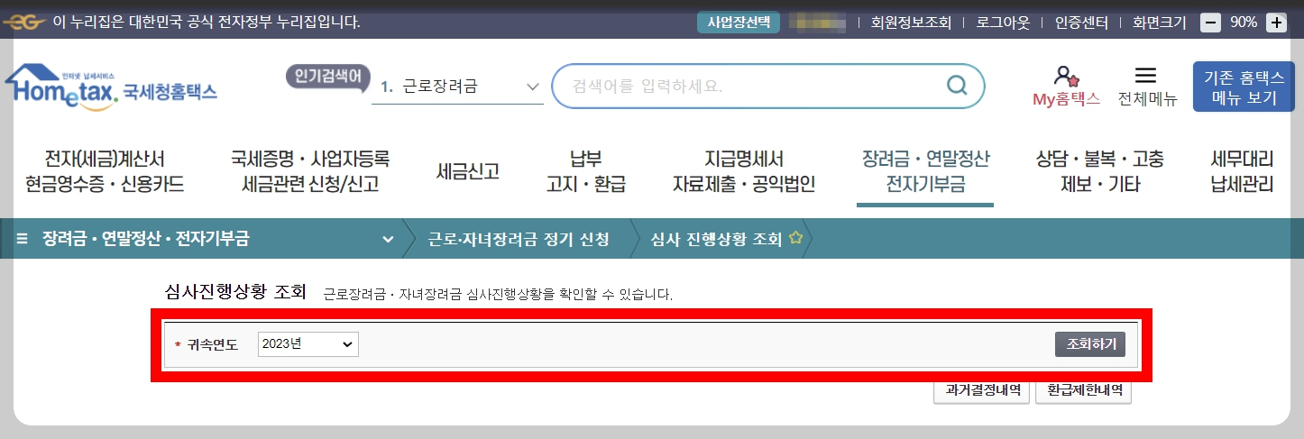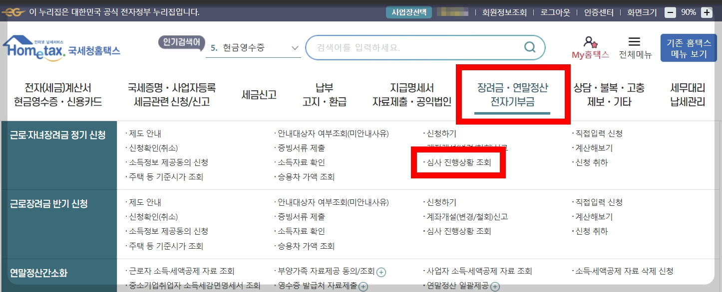 정상적으로 홈택스에 로그인 했다면 장려금/연말정산/전자기부금 → 근로/자녀장려금 정기신청 → 심사 진행상황 조회 를 클릭해 줍니다.