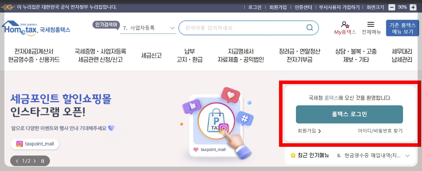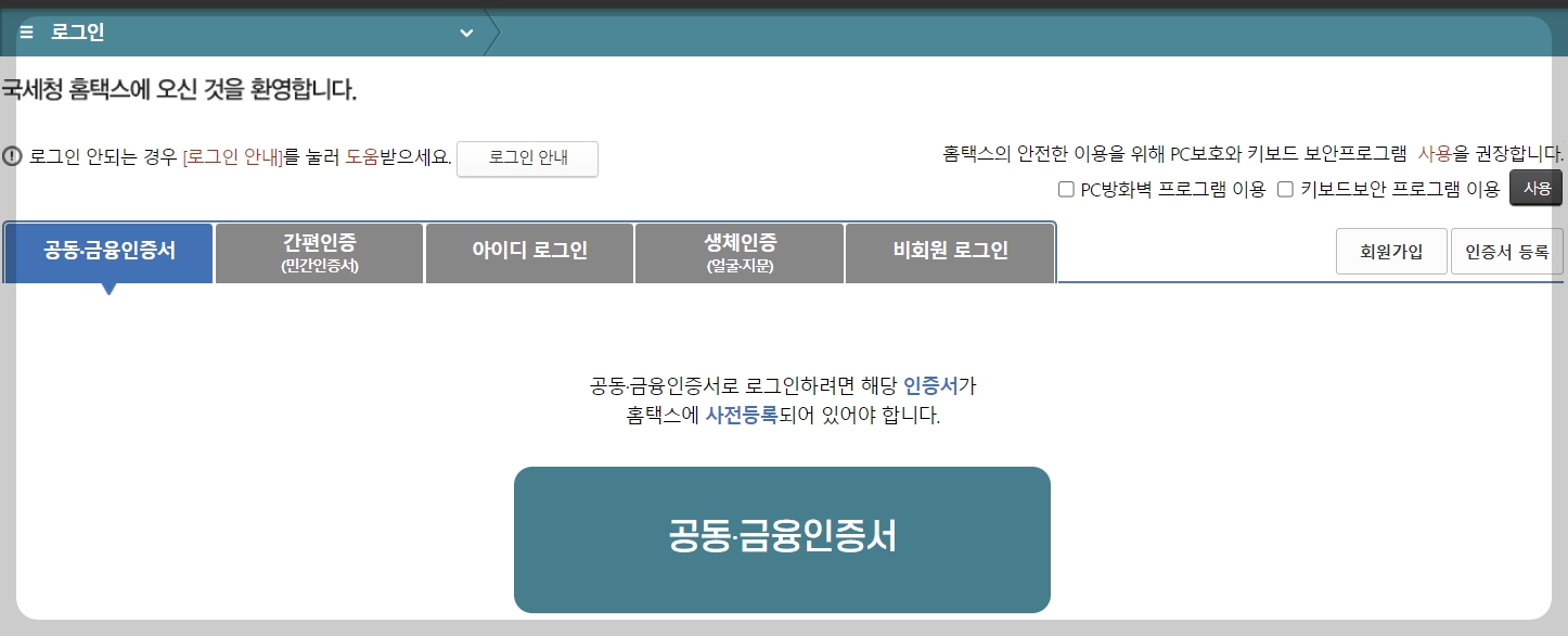 자녀장려금 지급일 조회를 위해 홈택스 사이트에 접속합니다. 접속 후 로그인 합니다. 홈택스 로그인은 공동, 금융인증서, 간편인증(민간인증서), 아이디 로그인, 생체인증, 비회원으로 가능한데 편한 방법으로 하시면 됩니다.